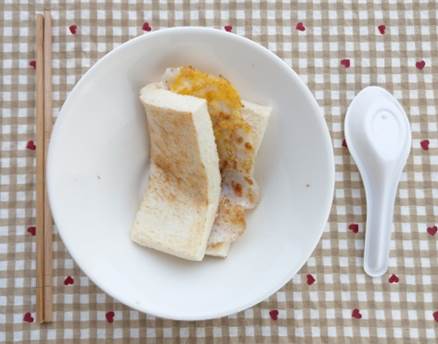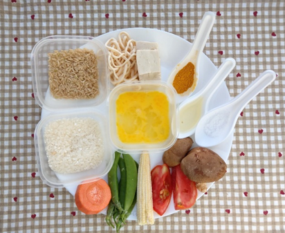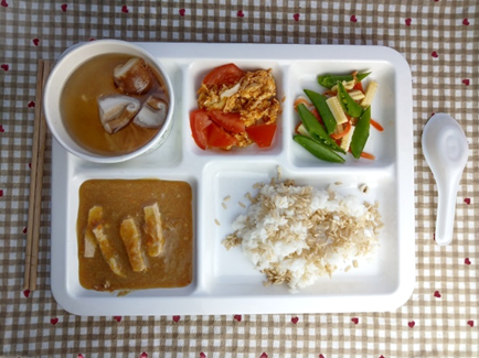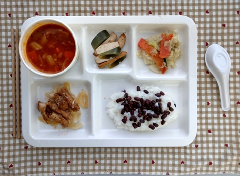 午餐:糙米飯+咖哩豆腐+番茄炒蛋+炒三蔬+香菇干絲湯
