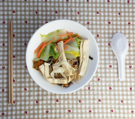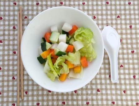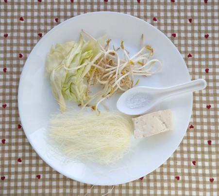 2.      油鍋中加入蔬菜及黃豆干炒熟加水