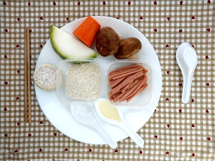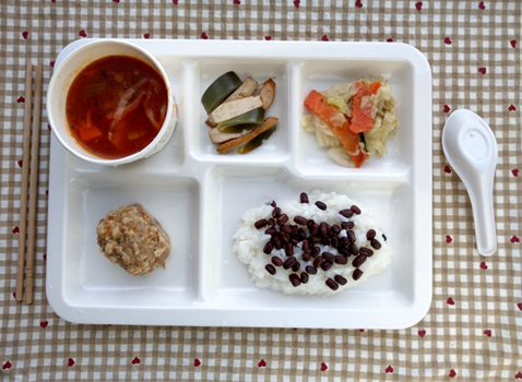 午餐:紅豆飯+素獅子頭+滷豆干+炒白菜+羅宋湯