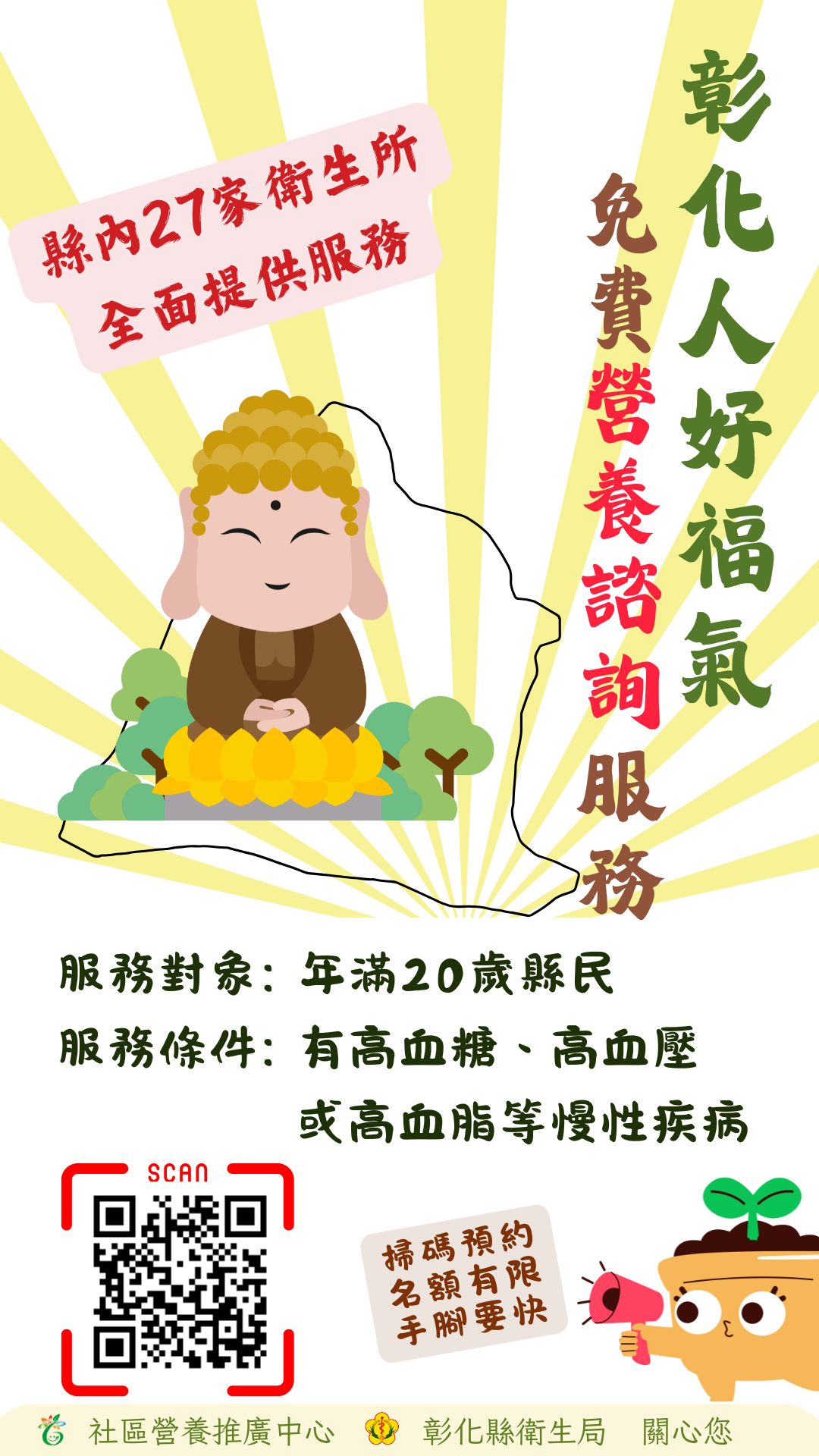 為促進縣民健康、預防慢性疾病,彰化縣衛生局結合縣內各鄉鎮市衛生所,推出「彰化人好福氣—免費營養諮詢服務」,即日起全面開放預約。凡年滿20歲、設籍本縣,且有高血壓、高血糖或高血脂等慢性疾病的民眾,皆可至衛生所接受專業營養師一對一的飲食諮詢與指導。
