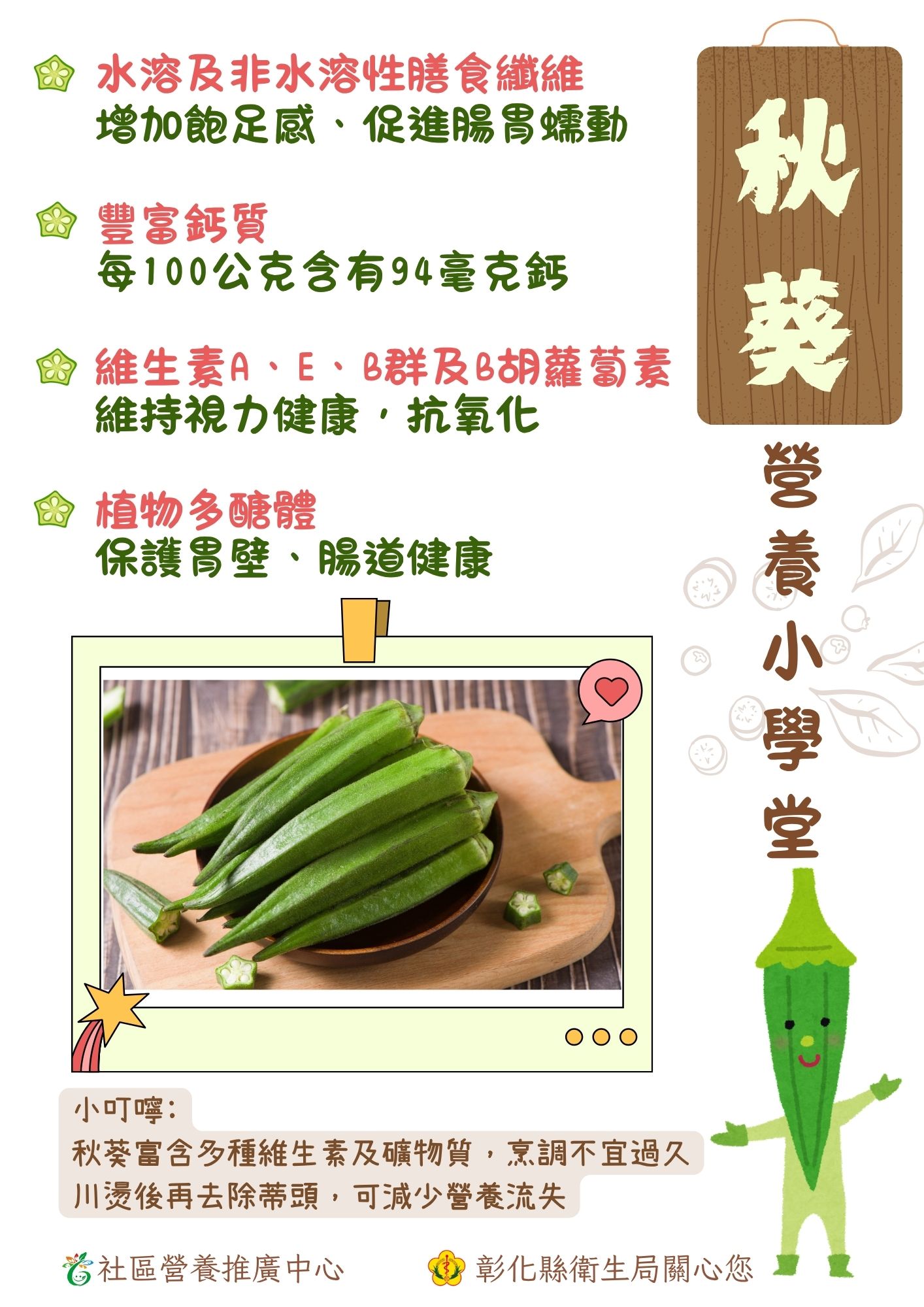 「秋葵」是近年廣受民眾喜愛的健康蔬菜。其滑嫩的口感與豐富的營養成分,成為控制體重、維持腸道健康的理想食材。秋葵含有豐富膳食纖維及維生素與礦物質,營養價值高且熱量低,無論大人小孩都適合食用。