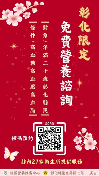 彰化縣衛生局呼籲,符合資格之縣民可把握機會,掃描宣導海報上的QR Code完成線上預約,即可安排營養諮詢服務。期盼透過持續推動營養介入與健康教育,協助縣民穩定控制三高、提升生活品質,共同邁向健康彰化的目標。